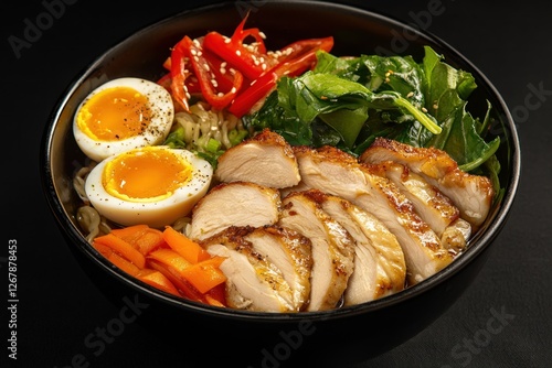 Delicious Chicken Ramen Bowl with perfectly cooked eggs, fresh vegetables and noodles