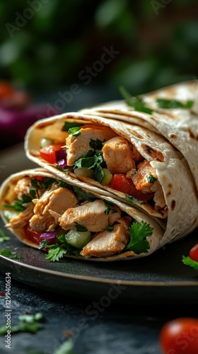 Delicious chicken wrap with fresh vegetables and herbs served on a dark plate