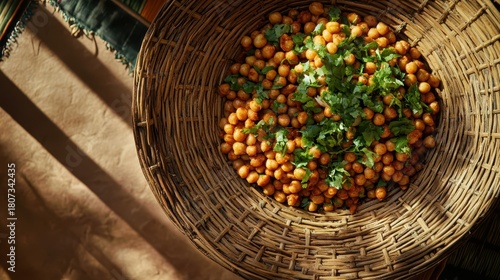 food, chickpea, basket, ethiopian, cookery, lentil, spiced, woven, rustic, overhead, angle, lighting, warm, dish, meal, vegetarian, vegan, healthy, brown, circular, texture, grain, garnish, cilantro, fresh, top, view, closeup, gold, delicious, traditional, culture, africa, eat, cooked, seed, legume, alimentary, table, wood, natural, shadow, detail, bright, sunlight, served, plate