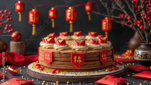 Delicious chocolate cake decorated with red envelopes and gold accents for festive celebration
