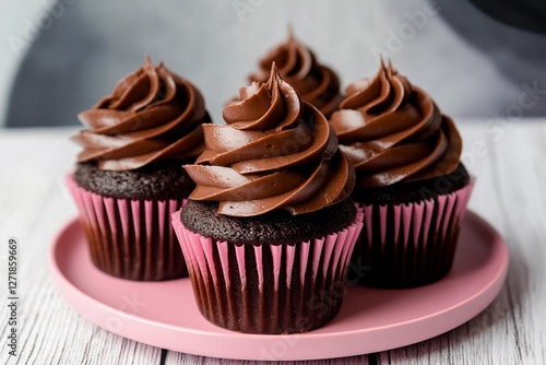 Delicious chocolate cupcakes with swirls of creamy frosting on a pink plate