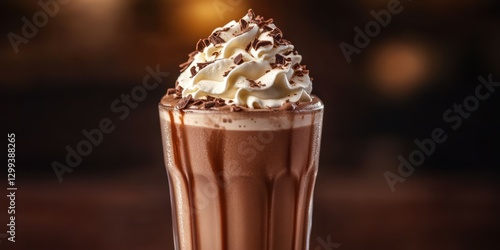 Delicious chocolate milkshake topped with whipped cream and chocolate shavings served in a tall glass