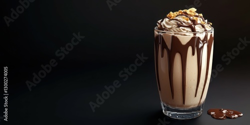 Delicious chocolate milkshake topped with whipped cream and chocolate syrup served in a tall glass