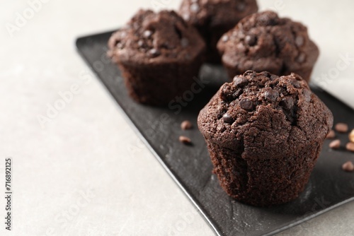Delicious chocolate muffins on light table, closeup. Space for text