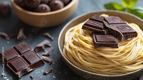 Delicious chocolate pieces placed on a plate of cooked spaghetti pasta with basil leaves in a rustic setting perfect for food lovers and dessert enthusiasts