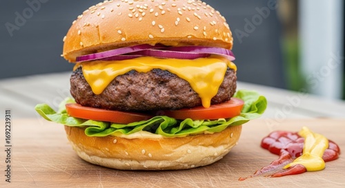 Delicious classic cheeseburger with fresh lettuce, tomato, onion, and melted cheese on a wooden surface, ready to eat.