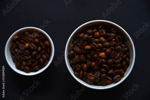 Delicious coffee beans in a ceramic white bowl on a black background. Coffee beans close-up in the dishes.