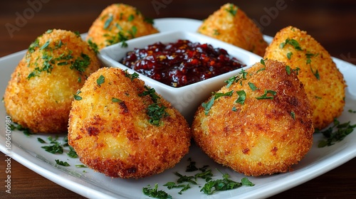 Delicious coxinha chicken croquettes with dipping sauce on plate.