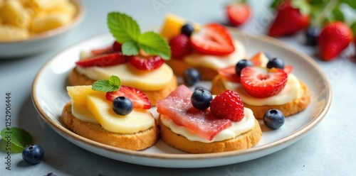 Delicious Creamy Fruit Toasts with Berries and Slices of Summer Fruit on a Plate