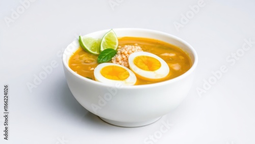 soup, creamy, delicious, egg, lime, garnish, bowl, white, food, cookery, culinary, tasty, healthy, fresh, ingredient, receipe, cooking, meal, dinner, lunch, breakfast, eatery, plate, citrous, yellow, orange, protein, yolk, herb, basil, rice, grain, comfort, hot, warm, spice, favor, texture, presentation, photo, still, life
