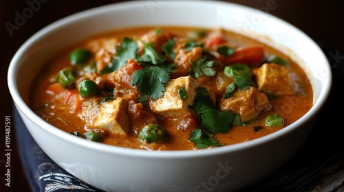 curry, tofu, vegetable, indian, food, receipe, cookery, dish, meal, dinner, lunch, spicey, creamy, tasty, delicious, healthy, vegetarian, vegan, homemade, cooking, pea, tomatoes, cilantro, bowl, plate, red, orange, white, green, brown, appetising, flavorful, aromatic, satisfying, opulent, culinary, gastronomy, epicure