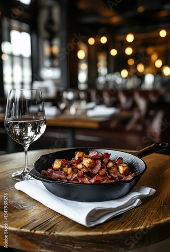 Delicious crispy bacon and golden potatoes served in a cast iron skillet with a glass of white wine in a warm and inviting restaurant setting