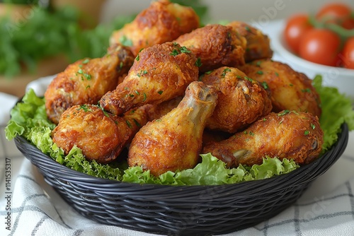 Delicious crispy fried chicken drumsticks served in a rustic black basket, garnished with fresh parsley and lettuce. Perfect for menus, food blogs, or advertising.