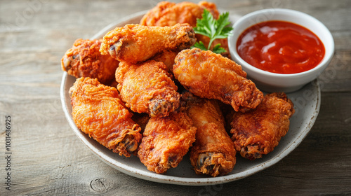 Delicious crispy korean fried chicken wings plate food photography tasty meal gourmet fashion background with copy space. for cuisine dishes restaurant recipe advertising