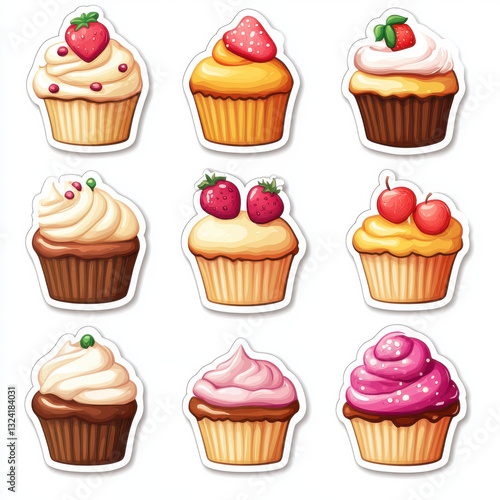 Delicious cupcakes with various toppings, including strawberries and cherries, arranged in grid. Each cupcake features unique frosting and colors, creating vibrant and appealing display