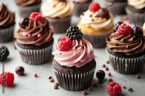 cupcake, frosting, chocolate, vanilla, raspberry, blackberry, cherry, fruit, decoration, sweet, dessert, treat, baked, good, pastry, confectionery, food, bakery, confection, delicious, deliciously, tasty, delightful, indulgence, celebration, party, birthday, special, occasion, snack, kitchen, homemade, professional, culinary, art, closeup, still, life, background, pattern, texture, colours, grey, brown, pink, white, red, black, close