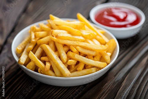 delicious french fries in a bowl and ketchup on a wooden table