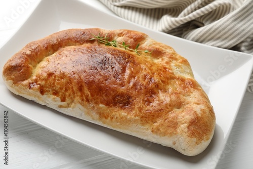 Delicious fresh calzone pizza on white wooden table, closeup