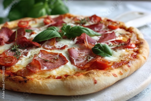 Delicious freshly baked pizza topped with sliced meats and fresh basil on a wooden board