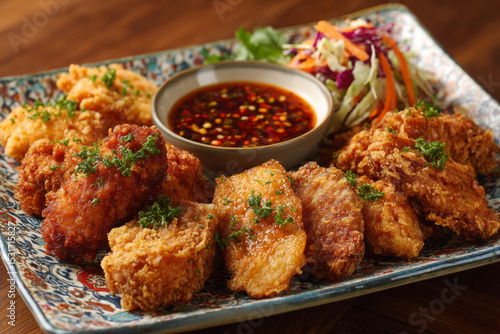 fried, chicken, platter, mixed, cut, dipping, sauce, fresh, salad, crispy, savoury, meal, cookery, food, epicure, eatery, dish, herb, spice, colourful, presentation, side, asian, skin, tender, flavorful, wing, thigh, breast, garnished, plate, dining, culinary, snack, indulgent, coating, gold, brown, delicious, tasty, comfort, party, feast, texture, spicey, sweet, lemony