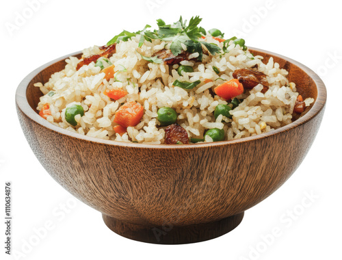 Delicious fried rice served in wooden bowl, cut out - stock png.