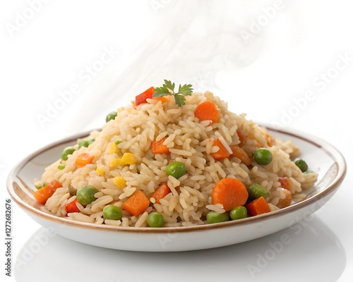Delicious fried rice with chicken, vegetable on top isolated on white background