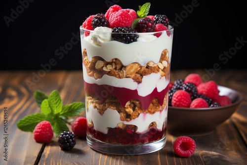 Delicious fruit parfait with fresh berries and granola on table, food photography