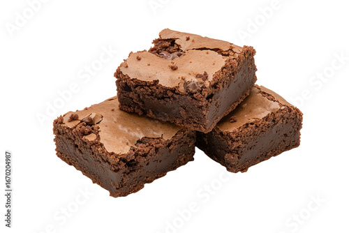 Delicious fudge brownies stacked on top of each other, isolated on a white background.
