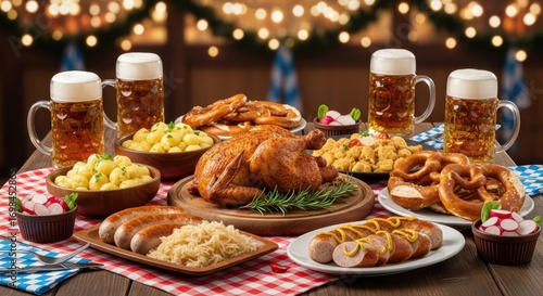oktoberfest, bavarian, beer, sausage, pretzel, potato salad, cabbage, mustard, radish, cupcake, party, festival, celebration, traditional, appetiser, main course, side, drink, gathering, feast, delicacy, savoury, hearty, table setting, culinary, cookery, food photography, appetising, homemade, delicious, summer, event, refreshment, gastronomy, hospitality