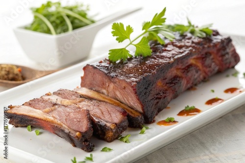 Delicious glazed pork ribs served with fresh herbs and savory sauce