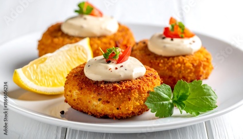 Delicious Golden Brown Crab Cakes Topped with Creamy Sauce and Garnish.
