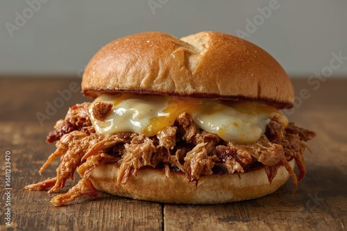 Delicious gooey cheese atop shredded pork sandwich, served on a wooden surface