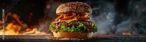 delicious, epicure, hamburger, juicy, beef, patty, crispy, lettuce, melt, cheese, favor, epicure, crave, fire, set, top, cookery, ground, sesame, broil, fiery, bar-b-q, sandwich, bread, steakhouse, smoke, chef, comfort, sauce, stack, taste, fill, texture, snack, feast, dinner, bar-b-q, tasty, quick, fresh, kitchen, layer, bacon, leaf, onion, tempt, ring, fast, brioche
