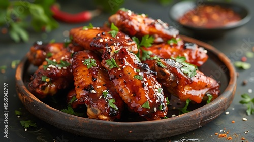 wing, chicken, food, glaze, sauce, spicey, chili, herb, sesame, dish, meal, cookery, epicure, lunch, dinner, eatery, gastronomy, culinary, meat, poultry, bar-b-q, grilled, cooked, plate, wooden, background, delicious, tasty, brown, dark, red, green, fresh, parsley, bowl, peppercorn, seed, snack, asian, bar-b-q, fried, roasted