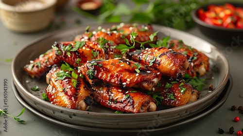 wing, chicken, food, glaze, sauce, spicey, chili, herb, sesame, dish, meal, cookery, epicure, lunch, dinner, eatery, gastronomy, culinary, meat, poultry, bar-b-q, grilled, cooked, plate, wooden, background, delicious, tasty, brown, dark, red, green, fresh, parsley, bowl, peppercorn, seed, snack, asian, bar-b-q, fried, roasted