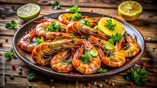 Delicious Grilled Shrimp Platter on Rustic Wooden Table