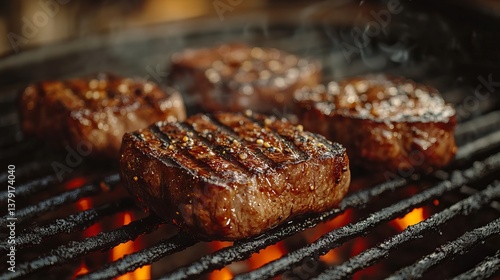 Delicious Grilled Steaks on Hot BBQ Grill Summer Food Photography Juicy Beef Meat Delicious Dinner Gourmet Food Barbecue Seasoning Spices Tasty Meal Restaurant Menu Background Image lunch yummy foodie