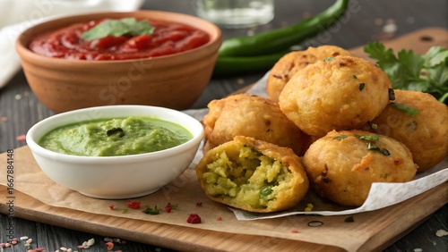 Delicious Gujarati batata vada, golden fried potato fritters, popular Indian street food snack enjoyed with spicy chutney"