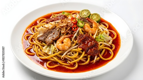 food, noodle, prawn, meat, dish, asian, cookery, seafood, stir fry, savoury, delicious, plate, meal, lunch, dinner, eatery, traditional, epicure, appetising, hot, spicey, chili, sauce, bean sprouts, lime, herb, aromatic, flavorful, cooked, prepared, homemade, asia, malaysia