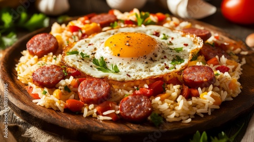 rice, egg, sausage, food, meal, cooking, breakfast, lunch, dinner, kitchen, ingredient, epicure, tasty, healthy, fresh, plate, preparation, cookery, eatery, comfort, homemade, yellow, spice, vegetable, parsley, organic, rustic, frying, delicious, savoury, traditional, crispy, protein, favor, herb, round, wood, serving, artisan, culinary, lunchtime, hearty, colourful, dish, presentation, nourishment, vibrant, side dish