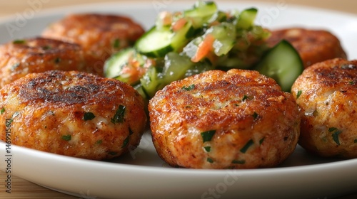 Delicious homemade chicken patties sit next to a fresh cucumber salad, showcasing a healthy and satisfying meal on a white plate ready to be enjoyed by diners.
