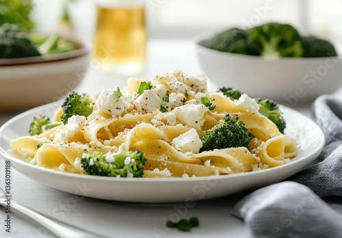Delicious Homemade Pasta with Fresh Broccoli and Creamy Feta Cheese on a White Plate in a Bright Kitchen Setting