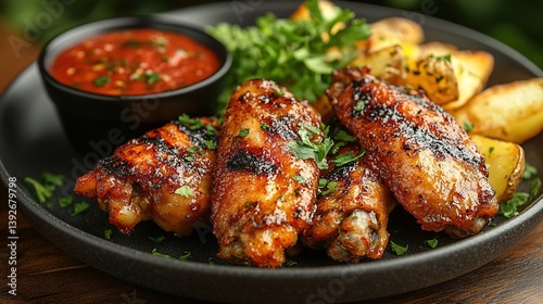 Delicious honey-glazed chicken wings served with roasted potatoes and red sauce