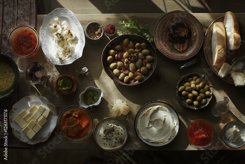 Delicious international breakfasts featuring turkish breakfast olives, cheese, and honey, beautifully arranged on a wooden table. Concept highlights international breakfasts as a culinary delight.