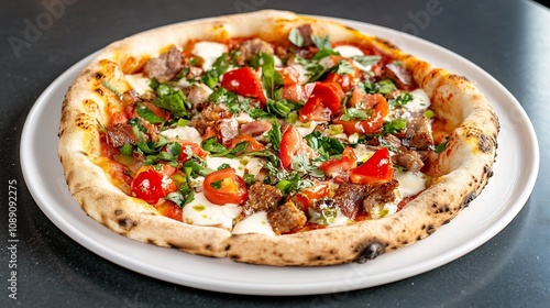 Delicious Italian pizza with fresh toppings on a white plate with a clean background and clear focus