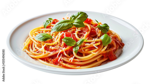 Delicious italian spaghetti with tomato sauce, basil, and grated cheese on transparent background