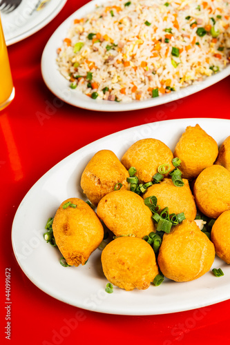 Delicious Japanese Food Meal Plate Dish Fried Dish On a Red Table