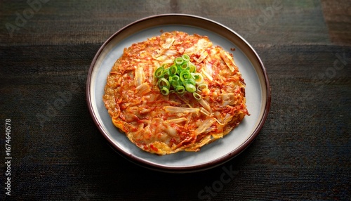 delicious kimchi pancake known as kimchijeon served on a plate this savory kimchi pancake is a popular dish in korean cuisine perfect for any meal or snack with delightful flavors
