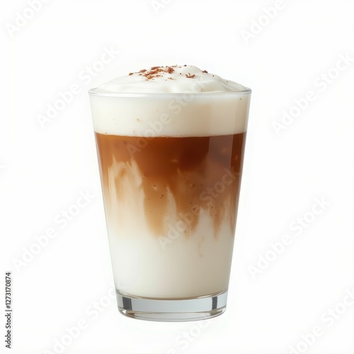 Delicious Layered Coffee Beverage with Frothy Topping in Clear Glass against White Background