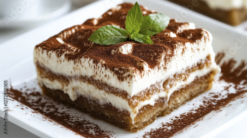 dessert, tiramisu, hot drink, cream, cocoa, mint, sweet, layered, italian, chocolate, food, epicure, indulgent, treat, slice, plate, eatery, homemade, pastry, confection, rich, creamy, delicious, mint leaf, italian cuisine, food photography, culinary, indulgence, tasty